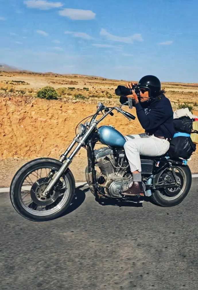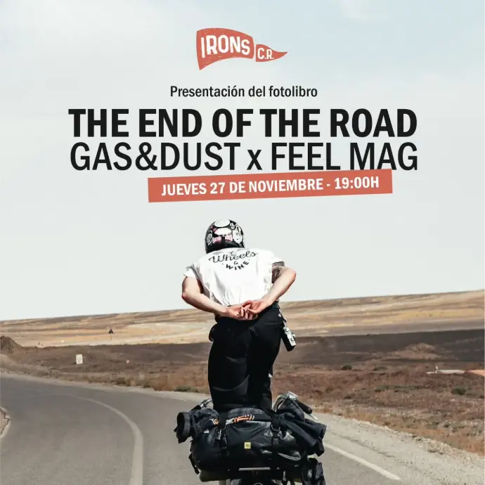 Fotógrafo y creador de la revista FEEL (Fuego en el lomo) documento durante el viaje con su camara a lomos de su moto los mometos mas iconicos. Todo se plasma en el libro The en of the road.